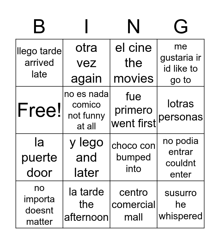 This bingo card has 16 words: la tarde the afternoon, no podia entrar couldnt enter, el cine the movies, llego tarde arrived late, la puerte door, otra vez again, choco con bumped into, centro comercial mall, Free!, no es nada comico not funny at all, no importa doesnt matter, me gustaria ir id like to go to, y lego and later, lotras personas, fue primero went first and susurro he whispered.