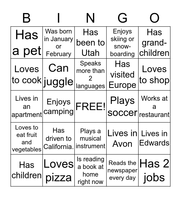 This bingo card has a free space and 24 words: Has driven to California., Loves pizza, Speaks more than 2 languages, Has children, Has grand- children, Has a pet, Loves to cook, Was born in January or February, Plays soccer, Plays a musical instrument, Has visited Europe, Lives in an apartment, Lives in Avon, Lives in Edwards, Can juggle, Reads the newspaper every day, Works at a restaurant, Has been to Utah, Loves to shop, Enjoys camping, Has 2 jobs, Loves to eat fruit and vegetables, Enjoys skiing or snow- boarding and Is reading a book at home right now.