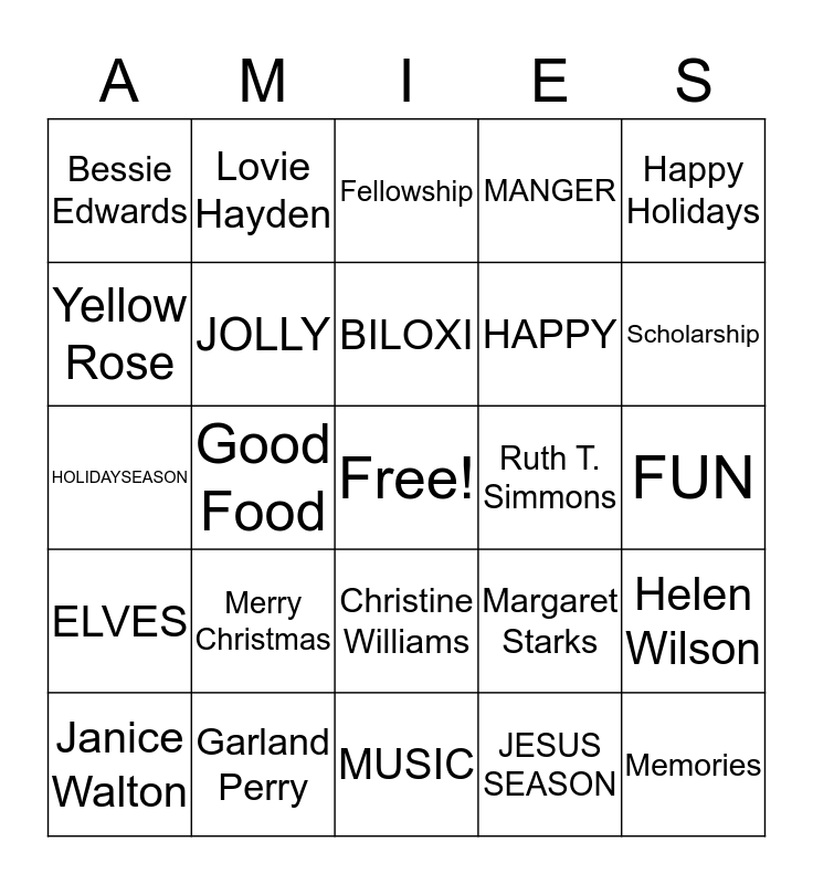 This bingo card has a free space and 24 words: Merry Christmas, Garland Perry, BILOXI, Janice Walton, Happy Holidays, Bessie Edwards, Yellow Rose, Lovie Hayden, Ruth T. Simmons, Christine Williams, HAPPY, HOLIDAYSEASON, Margaret Starks, Helen Wilson, JOLLY, JESUS SEASON, FUN, Fellowship, Scholarship, Good Food, Memories, ELVES, MANGER and MUSIC.