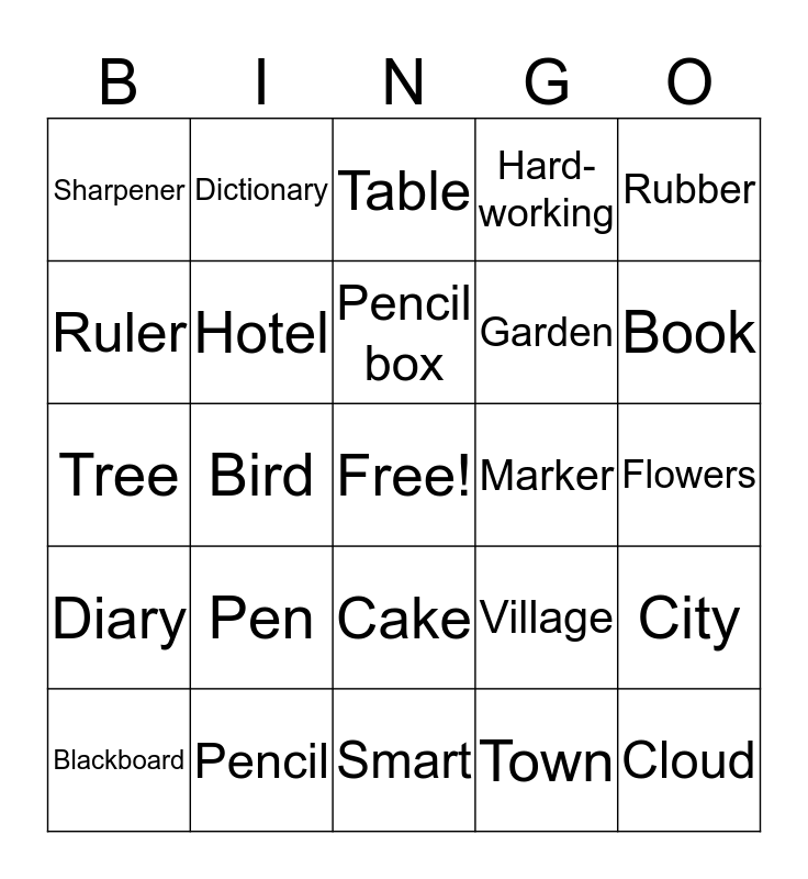 This bingo card has a free space and 24 words: Pen, Pencil, Pencil box, Blackboard, Rubber, Sharpener, Ruler, Dictionary, Marker, Cake, Garden, Tree, Village, City, Hotel, Town, Flowers, Table, Book, Bird, Cloud, Diary, Hard-working and Smart.