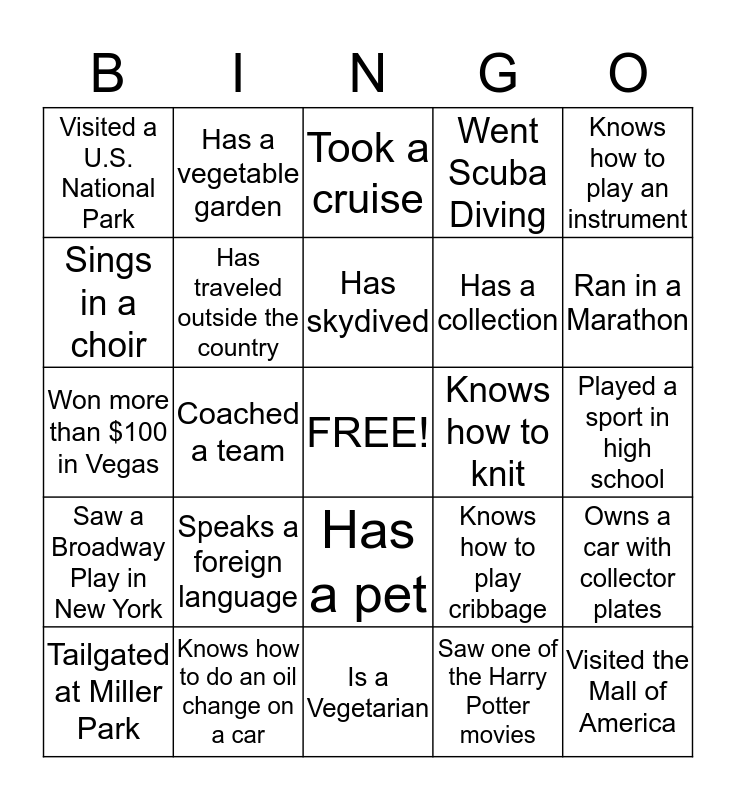 This bingo card has a free space and 24 words: Speaks a foreign language, Knows how to do an oil change on a car, Has skydived, Tailgated at Miller Park, Knows how to play an instrument, Visited a U.S. National Park, Sings in a choir, Has a vegetable garden, Knows how to knit, Has a pet, Has a collection, Won more than $100 in Vegas, Knows how to play cribbage, Owns a car with collector plates, Has traveled outside the country, Saw one of the Harry Potter movies, Played a sport in high school, Took a cruise, Ran in a Marathon, Coached a team, Visited the Mall of America, Saw a Broadway Play in New York, Went Scuba Diving and Is a Vegetarian.