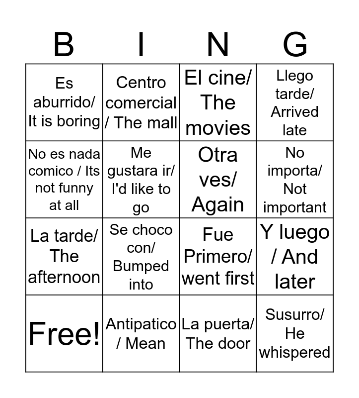 This bingo card has 16 words: Antipatico / Mean, Y luego / And later, El cine/ The movies, Es aburrido/ It is boring, La tarde/ The afternoon, Centro comercial / The mall, Fue Primero/ went first, La puerta/ The door, No es nada comico / Its not funny at all, Me gustara ir/ I'd like to go, Free!, Llego tarde/ Arrived late, Se choco con/ Bumped into, No importa/ Not important, Otra ves/ Again and Susurro/ He whispered.