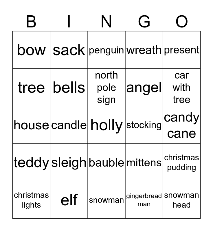This bingo card has 30 words: elf, santa hat, candle, polar bear, bow, penguin, bells, bauble, stocking, snowman, candy cane, holly, gingerbread man, snowman head, car with tree, santa, mittens, teddy, sleigh, present, house, reindeer, sack, angel, tree, wreath, christmas pudding, christmas lights, north pole sign and hot chocolate.