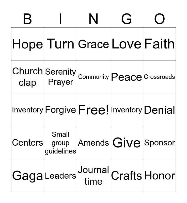This bingo card has a free space and 29 words: Gaga, Worship, Forgive, Jesus, Hope, Grace, Serenity Prayer, Small group guidelines, Inventory, Leaders, Denial, Honor, Journal time, Crafts, Crossroads, Cp rocks, Amends, Centers, Faith, Inventory, Give, Friends, Peace, Church clap, Love, Turn, Sponsor, Community and Confess.
