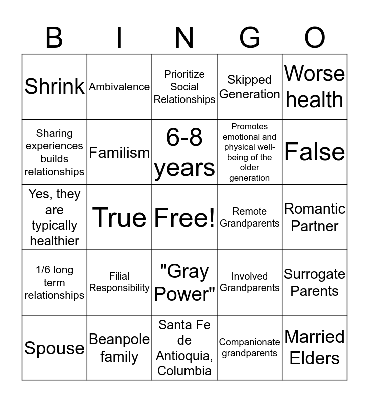 This bingo card has a free space and 24 words: Spouse, Filial Responsibility, 6-8 years, Companionate grandparents, Worse health, Shrink, Ambivalence, Prioritize Social Relationships, Remote Grandparents, Romantic Partner, Yes, they are typically healthier, Familism, Involved Grandparents, Surrogate Parents, Sharing experiences builds relationships, Beanpole family, Santa Fe de Antioquia, Columbia, Skipped Generation, False, 1/6 long term relationships, True, "Gray Power", Promotes emotional and physical well-being of the older generation and Married Elders.