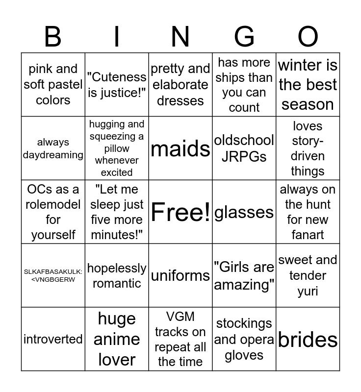 This bingo card has a free space and 24 words: hopelessly romantic, huge anime lover, maids, introverted, winter is the best season, pink and soft pastel colors, always daydreaming, "Cuteness is justice!", glasses, uniforms, oldschool JRPGs, OCs as a rolemodel for yourself, "Girls are amazing", sweet and tender yuri, hugging and squeezing a pillow whenever excited, stockings and opera gloves, always on the hunt for new fanart, pretty and elaborate dresses, loves story-driven things, "Let me sleep just five more minutes!", brides, SLKAFBASAKULK: <VNGBGERW, has more ships than you can count and VGM tracks on repeat all the time.