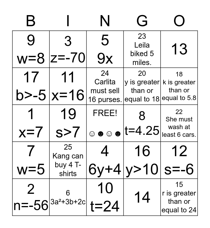 This bingo card has a free space and 24 words: 25 Kang can buy 4 T-shirts, 6 3a²+3b+2c, 24 Carlita must sell 16 purses., 2 n=-56, 13, 9 w=8, 17 b>-5, 3 z=-70, 8 t=4.25, 4 6y+4, 20 y is greater than or equal to 18, 1 x=7, 16 y>10, 12 s=-6, 11 x=16, 14, 22 She must wash at least 6 cars., 5 9x, 18 k is greater than or equal to 5.8, 19 s>7, 15 r is greater than or equal to 24, 7 w=5, 23 Leila biked 5 miles. and 10 t=24.