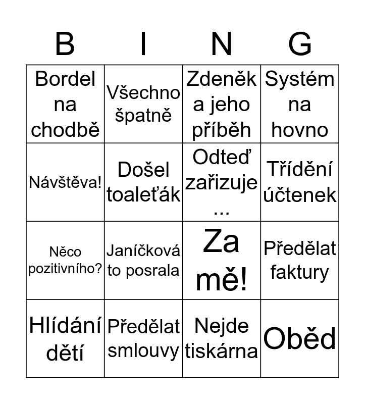 This bingo card has 16 words: Předělat smlouvy, Předělat faktury, Zdeněk a jeho příběh, Bordel na chodbě, Něco pozitivního?, Všechno špatně, Za mě!, Nejde tiskárna, Návštěva!, Došel toaleťák, Hlídání dětí, Systém na hovno, Janíčková to posrala, Třídění účtenek, Odteď zařizuje ... and Oběd.