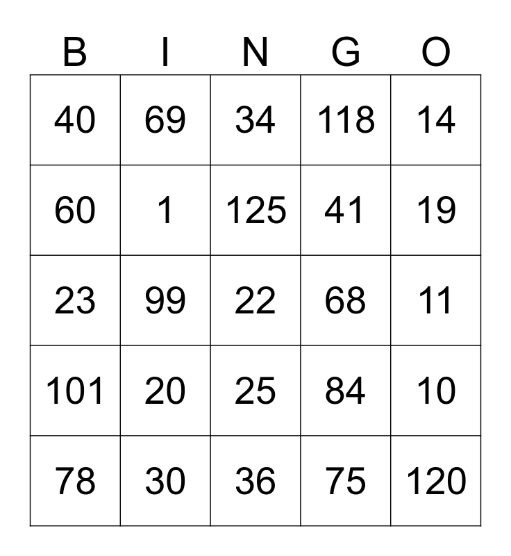 This bingo card has a free space and 24 words: 20, 30, 125, 78, 14, 40, 60, 69, 68, 25, 41, 23, 84, 10, 1, 75, 11, 34, 19, 99, 120, 101, 118 and 36.