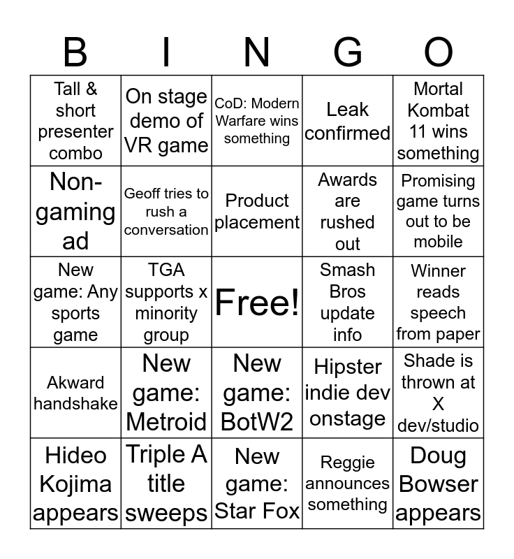 This bingo card has a free space and 45 words: Nintendo, Sony, and Microsoft take the stage together, Doug Bowser appears, Sora appears, Hideo Kojima appears, Shinji Hashimoto appears, Reggie announces something, CoD: Modern Warfare wins something, Baba Is You wins Indie Game, Mortal Kombat 11 wins something, Triple A title sweeps, Leak confirmed, Smash Bros update info, New game: BotW2, New game: Metroid, New game: Bayonetta, New game: Star Fox, New game: Call of Duty, New game: Any sports game, World Premier show no in game footage, Promising game turns out to be mobile, On stage demo of VR game, Celebrity "loves gaming", Celebrity presents an award, Tall & short presenter combo, Winner reads speech from phone, Winner reads speech from paper, Sexualy joke made, Shy developer onstage, Hipster indie dev onstage, Akward handshake, Someone swears and apologize, Shade is thrown at X dev/studio, Delayed/now in development "hype", TGA supports Hong Kong, TGA supports Blizzard, TGA supports x minority group, "Make sure to tweet", "And no microtransaction!", Technical difficulties during show, Product placement, Non-gaming ad, Awards are rushed out, Award speech cut short, Geoff tries to rush a conversation and Bad music performance of video game music.