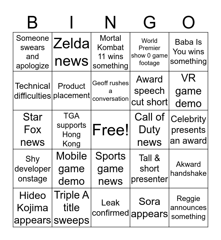 This bingo card has a free space and 45 words: Nintendo, Sony, Microsoft on stage together, Reggie announces something, Shinji Hashimoto appears, Hideo Kojima appears, Doug Bowser appears, Sora appears, Mortal Kombat 11 wins something, Call of Duty wins something, Baba Is You wins something, Triple A title sweeps, World Premier show 0 game footage, Call of Duty news, Sports game news, Mobile game demo, Smash Bros news, Leak confirmed, Bayonetta news, Star Fox news, Metroid news, VR game demo, Zelda news, Winner reads speech from phone, Winner reads speech from paper, Someone swears and apologize, Shade thrown at X dev/studio, Celebrity presents an award, Hipster indie dev onstage, Celebrity "loves gaming", Tall & short presenter, Shy developer onstage, Sexual joke made, Akward handshake, Delayed/now in development "hype", TGA supports x minority group, "And no microtransaction!", TGA supports Hong Kong, TGA supports Blizzard, "Make sure to tweet", Bad music performance of video game music, Geoff rushes a conversation, Technical difficulties, Award speech cut short, Awards are rushed out, Product placement and Non-gaming ad.
