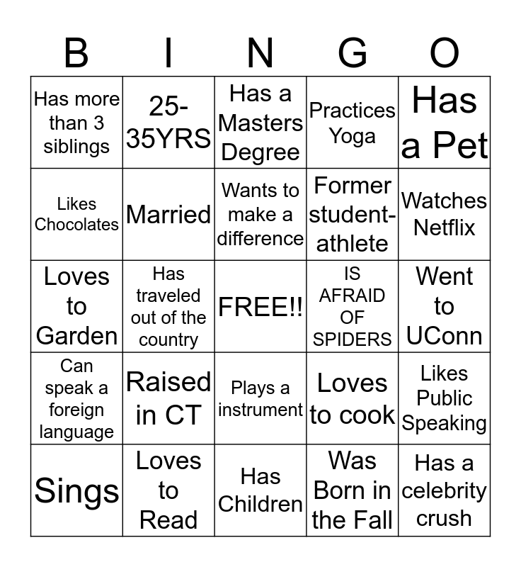 This bingo card has a free space and 24 words: Raised in CT, Loves to Read, Wants to make a difference, Sings, Has a Pet, Has more than 3 siblings, Likes Chocolates, 25-35YRS, IS AFRAID OF SPIDERS, Plays a instrument, Former student-athlete, Loves to Garden, Loves to cook, Likes Public Speaking, Married, Was Born in the Fall, Went to UConn, Has a Masters Degree, Watches Netflix, Has traveled out of the country, Has a celebrity crush, Can speak a foreign language, Practices Yoga and Has Children.