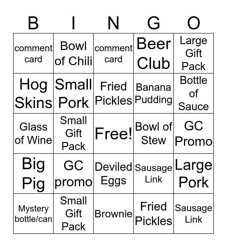 This bingo card has a free space and 24 words: GC promo, Small Gift Pack, Fried Pickles, Mystery bottle/can, Large Gift Pack, comment card, Hog Skins, Bowl of Chili, Bowl of Stew, Deviled Eggs, Banana Pudding, Glass of Wine, Sausage Link, Large Pork, Small Pork, Fried Pickles, GC Promo, comment card, Bottle of Sauce, Small Gift Pack, Sausage Link, Big Pig, Beer Club and Brownie.