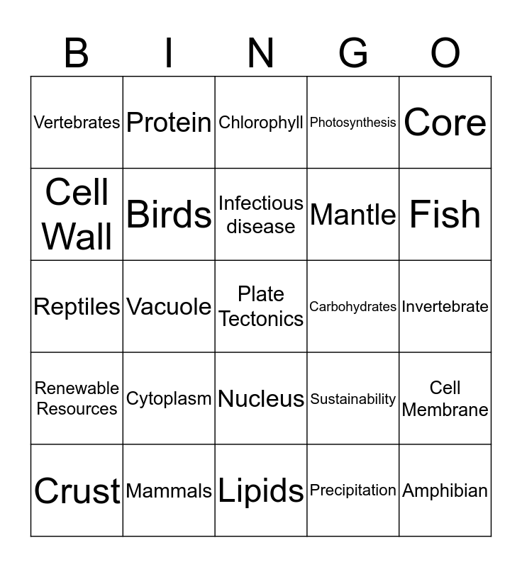 This bingo card has 25 words: Cytoplasm, Lipids, Infectious disease, Crust, Core, Vertebrates, Cell Wall, Protein, Carbohydrates, Nucleus, Mantle, Reptiles, Sustainability, Cell Membrane, Birds, Amphibian, Invertebrate, Chlorophyll, Fish, Vacuole, Plate Tectonics, Mammals, Renewable Resources, Photosynthesis and Precipitation.
