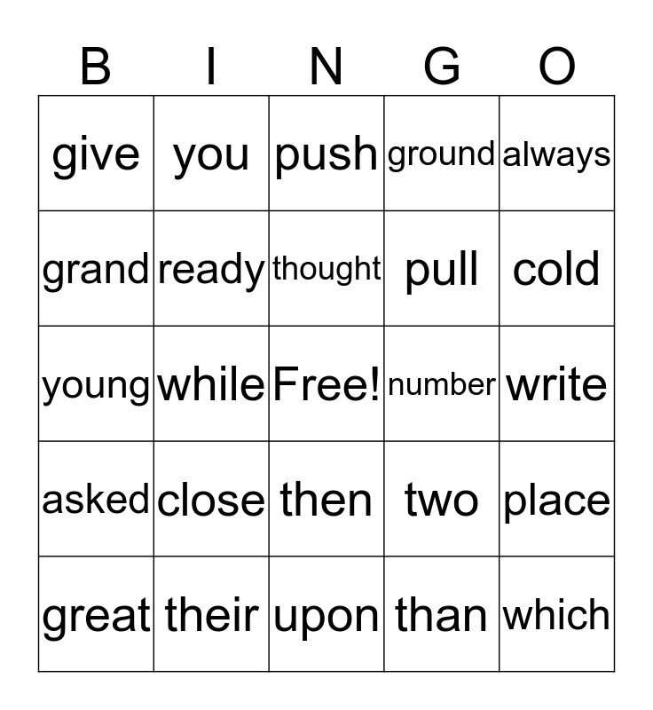 This bingo card has a free space and 24 words: close, their, thought, great, always, give, grand, you, number, then, pull, young, two, place, ready, than, write, push, cold, while, which, asked, ground and upon.