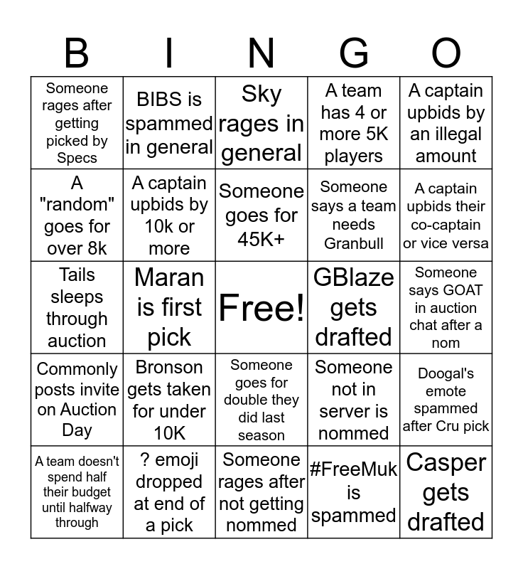 This bingo card has a free space and 24 words: Bronson gets taken for under 10K, ? emoji dropped at end of a pick, Someone goes for 45K+, A team doesn't spend half their budget until halfway through, A captain upbids by an illegal amount, Someone rages after getting picked by Specs, A "random" goes for over 8k, BIBS is spammed in general, GBlaze gets drafted, Someone goes for double they did last season, Someone says a team needs Granbull, Tails sleeps through auction, Someone not in server is nommed, Doogal's emote spammed after Cru pick, A captain upbids by 10k or more, #FreeMuk is spammed, Someone says GOAT in auction chat after a nom, Sky rages in general, A captain upbids their co-captain or vice versa, Maran is first pick, Casper gets drafted, Commonly posts invite on Auction Day, A team has 4 or more 5K players and Someone rages after not getting nommed.
