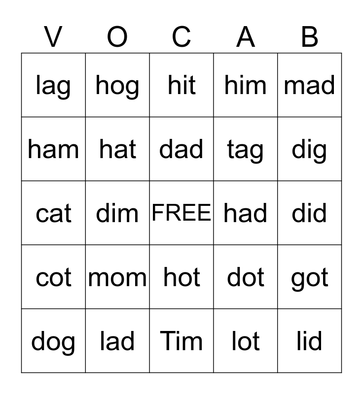 This bingo card has a free space and 24 words: mom, lad, dad, dog, mad, lag, ham, hog, had, hot, tag, cat, dot, got, hat, lot, did, hit, dig, dim, lid, cot, him and Tim.