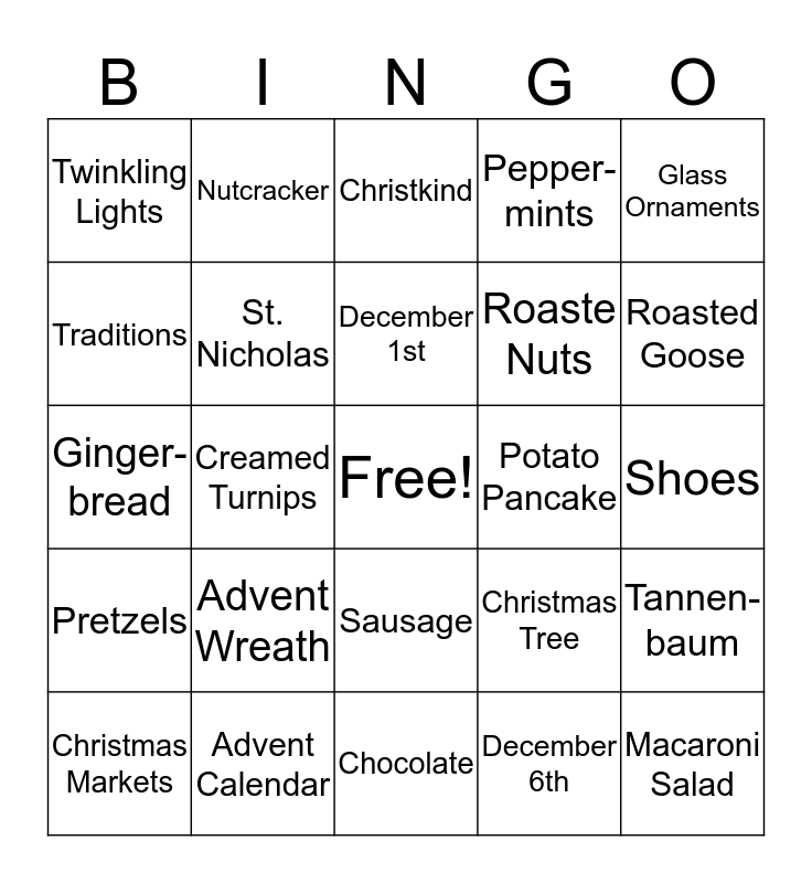 This bingo card has a free space and 24 words: Advent Wreath, Advent Calendar, December 1st, Christmas Markets, Glass Ornaments, Twinkling Lights, Traditions, Nutcracker, Potato Pancake, Sausage, Roaste Nuts, Ginger-bread, Christmas Tree, Tannen-baum, St. Nicholas, December 6th, Shoes, Christkind, Roasted Goose, Creamed Turnips, Macaroni Salad, Pretzels, Pepper-mints and Chocolate.