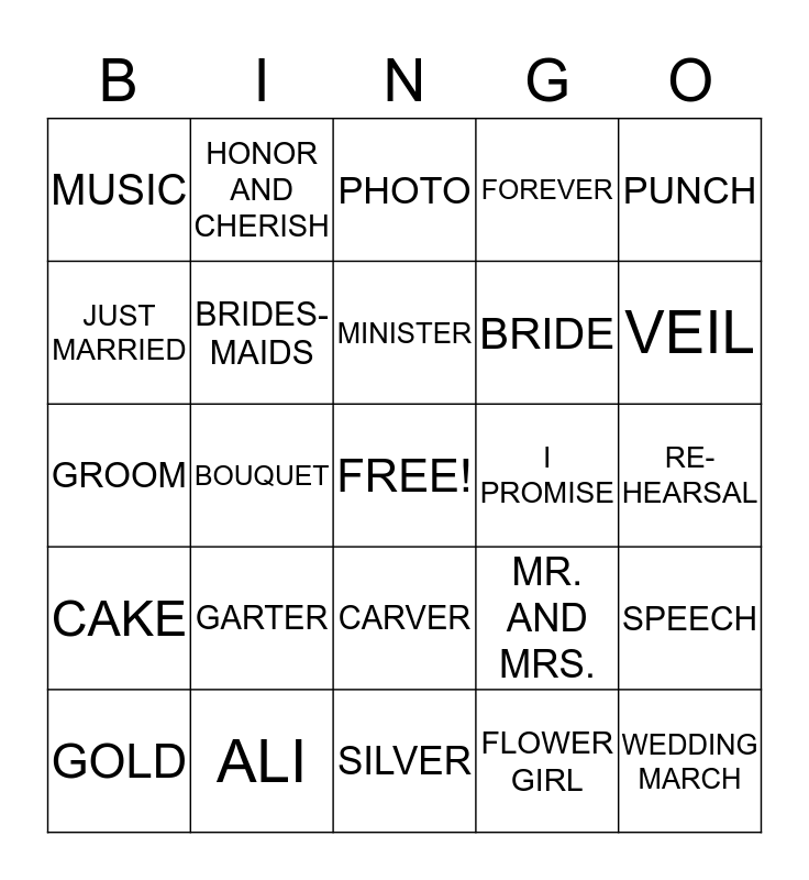 This bingo card has a free space and 24 words: GARTER, ALI, MINISTER, GOLD, PUNCH, MUSIC, JUST MARRIED, HONOR AND CHERISH, I PROMISE, CARVER, BRIDE, GROOM, MR. AND MRS., SPEECH, BRIDES- MAIDS, FLOWER GIRL, RE-HEARSAL, PHOTO, VEIL, BOUQUET, WEDDING MARCH, CAKE, FOREVER and SILVER.