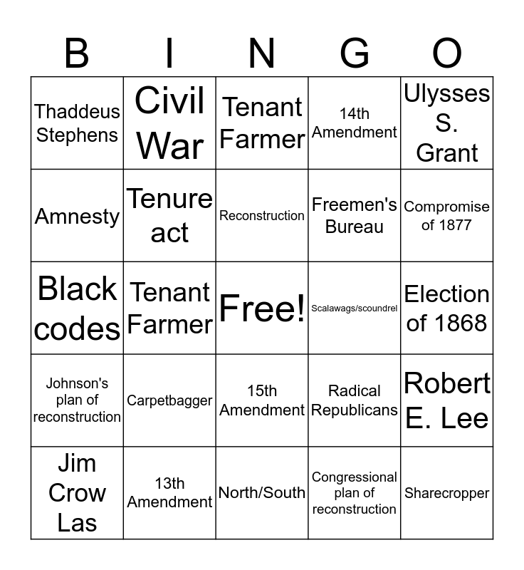 This bingo card has a free space and 24 words: Carpetbagger, 13th Amendment, Reconstruction, Jim Crow Las, Ulysses S. Grant, Thaddeus Stephens, Amnesty, Civil War, Scalawags/scoundrel, 15th Amendment, Freemen's Bureau, Black codes, Radical Republicans, Robert E. Lee, Tenure act, Congressional plan of reconstruction, Election of 1868, Tenant Farmer, Compromise of 1877, Tenant Farmer, Sharecropper, Johnson's plan of reconstruction, 14th Amendment and North/South.