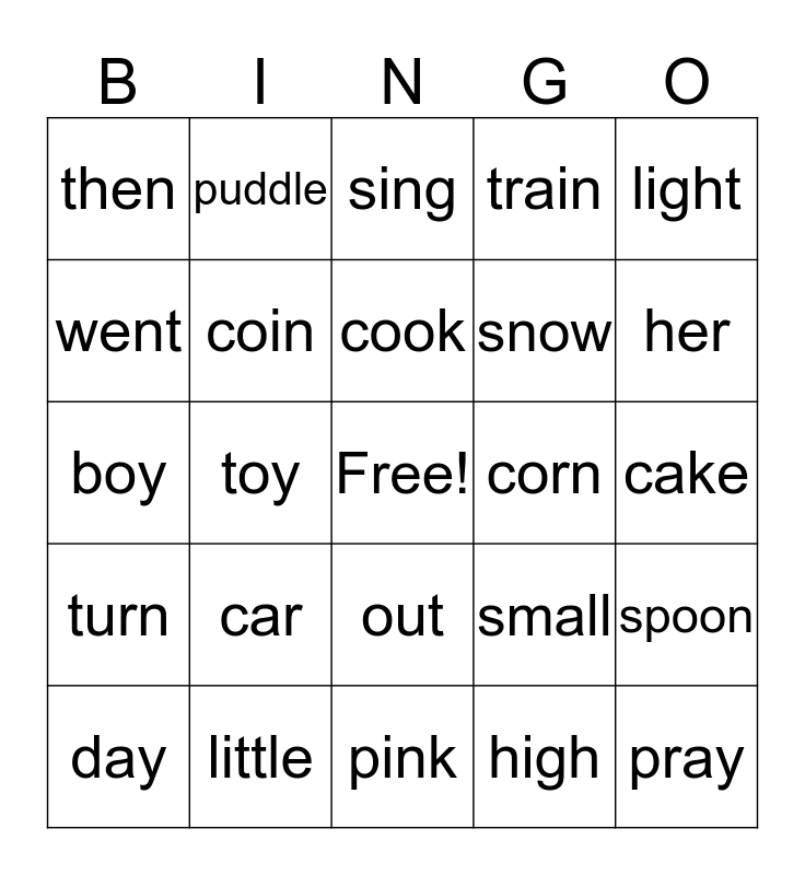This bingo card has a free space and 24 words: car, little, cook, day, light, then, went, puddle, corn, out, snow, boy, small, spoon, coin, high, cake, sing, her, toy, pray, turn, train and pink.