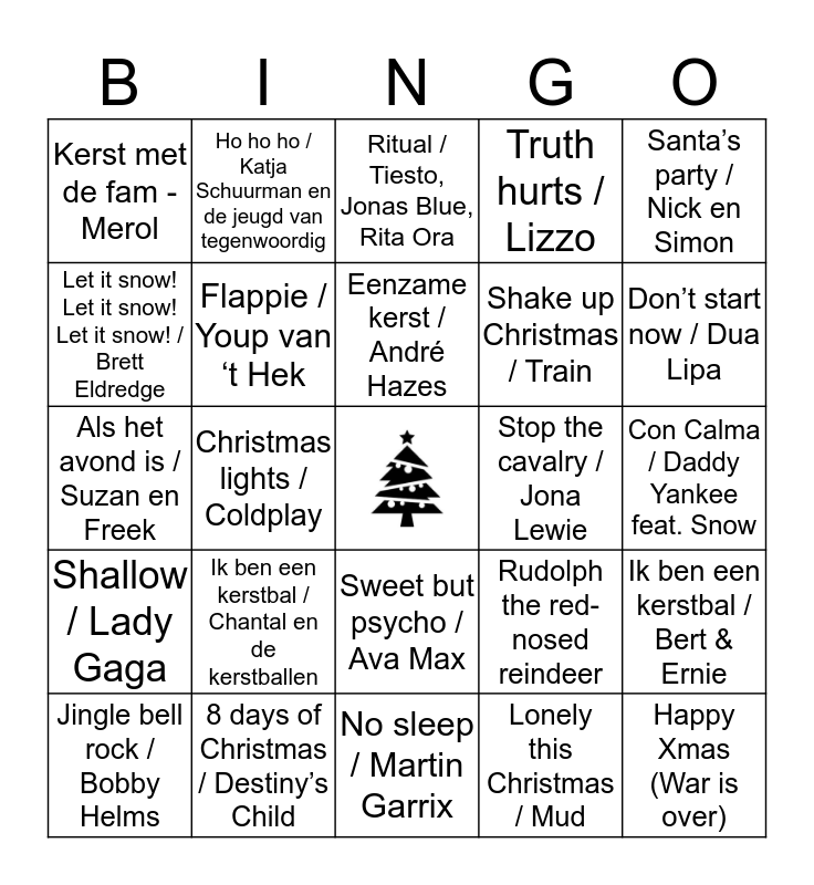 This bingo card has a free space and 53 words: Last Christmas / Wham, Happy Xmas (War is over), Do they know it’s Christmas / Band Aid 2014, Lonely this Christmas / Mud, Ik ben een kerstbal / Chantal en de kerstballen, Happy new year / ABBA, Ho ho ho / Katja Schuurman en de jeugd van tegenwoordig, Santa baby / Kylie Minogue, Let it snow! Let it snow! Let it snow! / Brett Eldredge, Rocking around the Christmas tree / Brenda Lee, Flappie / Youp van ‘t Hek, Oh denneboom, Ik ben een kerstbal / Bert & Ernie, Rudolph the red-nosed reindeer, Feliz Navidad / José Feliciano, Jingle bell rock / Bobby Helms, Eenzame kerst / André Hazes, Stop the cavalry / Jona Lewie, Being alone at Christmas / Miss Montreal, Santa’s party / Nick en Simon, Christmas lights / Coldplay, All I want for Christmas is you / Mariah Carey, Shake up Christmas / Train, Kerst met de fam - Merol, De kerstezel / kinderen voor kinderen, 8 days of Christmas / Destiny’s Child, Wat ik wil met kerstmis… ben jij! / Kus ft. Chris & Vivienne, Alleen door jou / Famke Louise feat Ronnie Flex, Pa Olvidarte / Emma Heesters & Rolf Sanchez, Don’t start now / Dua Lipa, Hoe het danst / Marco Borsato, Armin van Buuren & Davina Michelle, Arcade / Duncan Laurence, Senorita / Shawn Mendes, Camila Cabello, Giant / Calvin Harris, Rag’n’Bone Man, Loca / Alvaro Soler, Copycat / Billie Eilish, Truth hurts / Lizzo, No sleep / Martin Garrix, Ritual / Tiesto, Jonas Blue, Rita Ora, Power over me / Dermot Kennedy, Higher love / Kygo, Whitney Houston, Hij is van mij / Kris Kross feat maan, Con Calma / Daddy Yankee feat. Snow, Memories / Maroon 5, Bad guy / Billie Eilish, Sweet but psycho / Ava Max, Total loss / Snollebollekes, Gerard Joling, Don’t call me up / Mabel, Als het avond is / Suzan en Freek, Shallow / Lady Gaga, SOS / Avicii & Aloe Blacc, Dance monkey / Tones and I and Verleden tijd / Frenna en Lil Kleine.