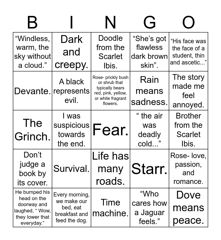 This bingo card has 25 words: Don’t judge a book by its cover., Every morning, we make our bed, eat breakfast and feed the dog., Fear., “Who cares how a Jaguar feels.”, “His face was the face of a student, thin and ascetic...”, “Windless, warm, the sky without a cloud.”, Dark and creepy., Doodle from the Scarlet Ibis., “ the air was deadly cold...”, Rose- love, passion, and romance., Devante., A black represents evil., Time machine., Starr., The story made me feel annoyed., He bumped his head on the doorway and laughed, “ Wow, they lower that everyday.”, I was suspicious towards the end., Rose- prickly bush or shrub that typically bears red, pink, yellow, or white fragrant flowers., Rain means sadness., Brother from the Scarlet Ibis., The Grinch., Survival., Life has many roads., “She’s got flawless dark brown skin”. and Dove means peace..