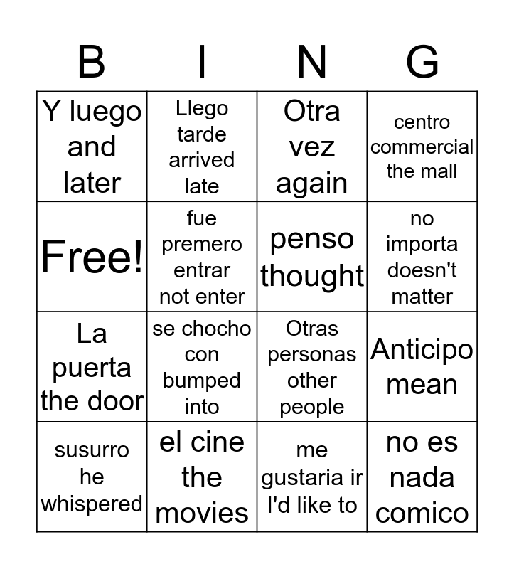 This bingo card has 16 words: el cine the movies, Anticipo mean, Otra vez again, Y luego and later, La puerta the door, Llego tarde arrived late, Otras personas other people, me gustaria ir I'd like to, Free!, fue premero entrar not enter, susurro he whispered, centro commercial the mall, se chocho con bumped into, no importa doesn't matter, penso thought and no es nada comico.