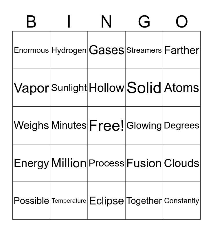 This bingo card has a free space and 24 words: Million, Temperature, Hollow, Possible, Farther, Enormous, Vapor, Hydrogen, Glowing, Process, Solid, Weighs, Fusion, Clouds, Sunlight, Together, Degrees, Gases, Atoms, Minutes, Constantly, Energy, Streamers and Eclipse.