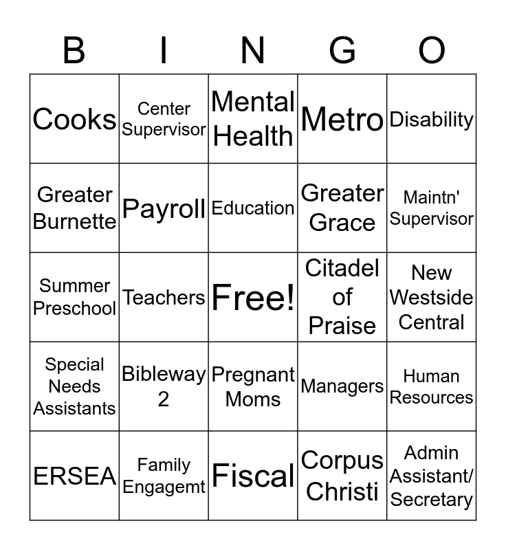 This bingo card has a free space and 38 words: Bibleway 1, Third New Hope, Family Advocate, Citadel of Praise, Human Resources, Special Needs Assistants, Teachers, Perinatal Educator, Greater Grace, Maintn' Supervisor, Greater Burnette, Payroll, Corpus Christi, New Westside Central, Cooks, Bibleway 2, St. John, Metro, Quality, Summer Preschool, Center Supervisor, Fiscal, Managers, Admin Assistant/ Secretary, WIC Clinic, Data, Pregnant Moms, Infant, Toddler, Children, Nutrition, Education, Health, Disability, ERSEA, Family Engagemt, Mental Health and Directors.