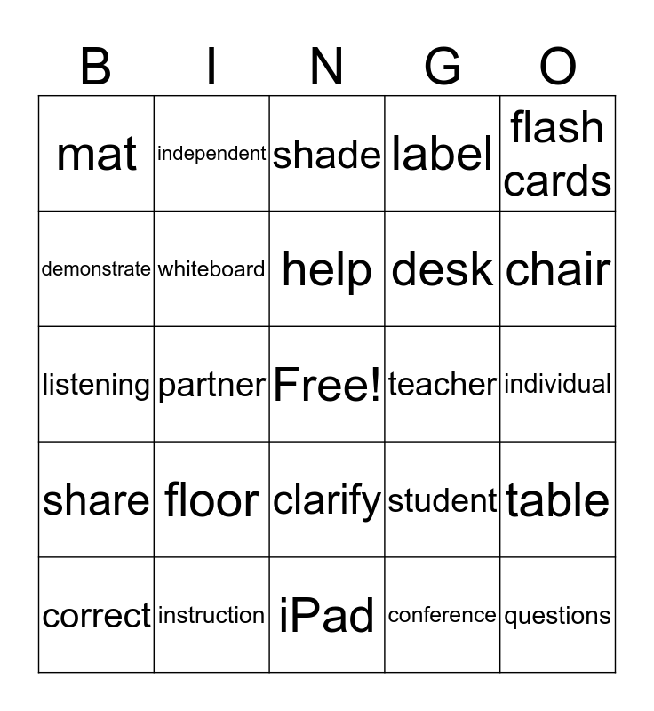 This bingo card has a free space and 24 words: floor, instruction, help, correct, flash cards, mat, demonstrate, independent, teacher, clarify, desk, listening, student, table, whiteboard, conference, individual, shade, chair, partner, questions, share, label and iPad.