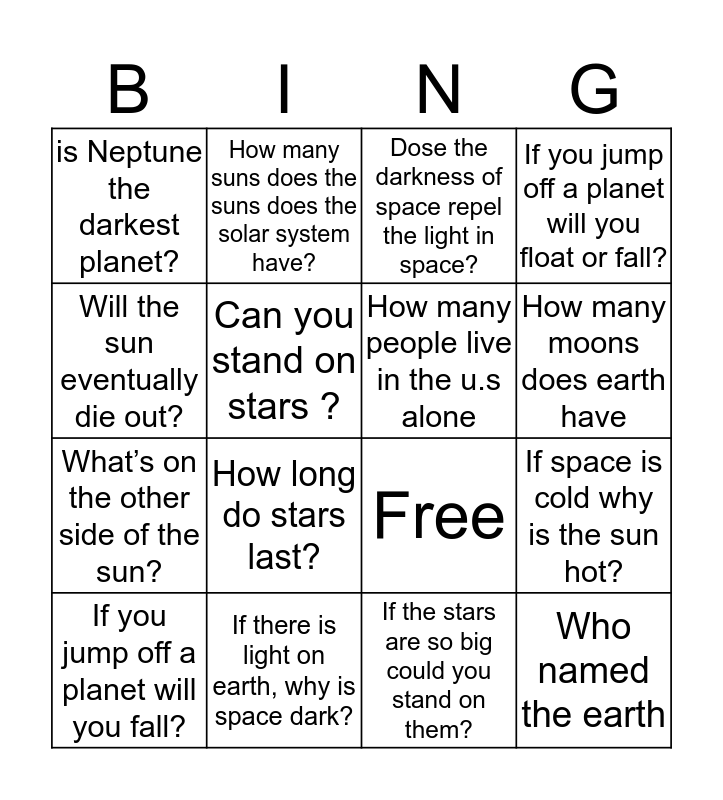This bingo card has 16 words: If there is light on earth, why is space dark?, If space is cold why is the sun hot?, Dose the darkness of space repel the light in space?, is Neptune the darkest planet?, What’s on the other side of the sun?, How many suns does the suns does the solar system have?, Free, If the stars are so big could you stand on them?, Will the sun eventually die out?, Can you stand on stars ?, If you jump off a planet will you fall?, If you jump off a planet will you float or fall?, How long do stars last?, How many moons does earth have, How many people live in the u.s alone and Who named the earth.