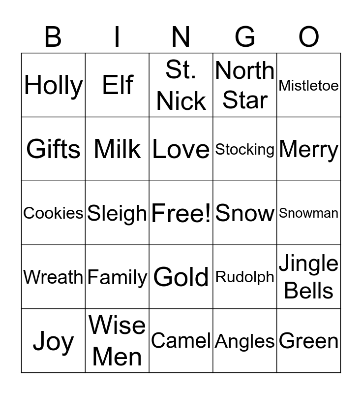 This bingo card has a free space and 24 words: Family, Wise Men, Love, Joy, Mistletoe, Holly, Gifts, Elf, Snow, Gold, Stocking, Cookies, Rudolph, Jingle Bells, Milk, Angles, Snowman, St. Nick, Merry, Sleigh, Green, Wreath, North Star and Camel.