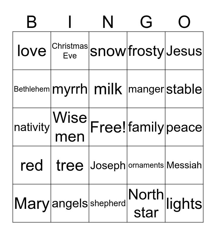 This bingo card has a free space and 24 words: tree, angels, milk, Mary, Jesus, love, Bethlehem, Christmas Eve, family, Joseph, manger, nativity, ornaments, Messiah, myrrh, North star, peace, snow, stable, Wise men, lights, red, frosty and shepherd.