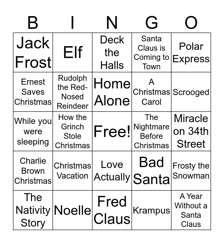 This bingo card has a free space and 38 words: It's a Wonderful Life, A Christmas Story, White Christmas, Rudolph the Red-Nosed Reindeer, Frosty the Snowman, Christmas Vacation, Home Alone, The Santa Clause, Polar Express, A Christmas Carol, How the Grinch Stole Christmas, Santa Claus is Coming to Town, A Year Without a Santa Claus, Miracle on 34th Street, Ernest Saves Christmas, Charlie Brown Christmas, Christmas with the Kranks, Deck the Halls, Jingle All the Way, The Nightmare Before Christmas, Jack Frost, Noelle, Scrooged, The Nativity Story, Lethal Weapon, Fred Claus, Die Hard, Gremlins, Rise of the Guardians, Frozen, The Holiday, Love Actually, Krampus, Elf, Trading Places, Bad Santa, While you were sleeping and 12 Dates of Christmas.