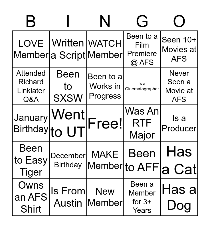 This bingo card has a free space and 24 words: December Birthday, Is From Austin, Been to a Works in Progress, Owns an AFS Shirt, Seen 10+ Movies at AFS, LOVE Member, Attended Richard Linklater Q&A, Written a Script, Was An RTF Major, MAKE Member, Is a Cinematographer, January Birthday, Been to AFF, Has a Cat, Been to SXSW, Been a Member for 3+ Years, Is a Producer, WATCH Member, Never Seen a Movie at AFS, Went to UT, Has a Dog, Been to Easy Tiger, Been to a Film Premiere @ AFS and New Member.