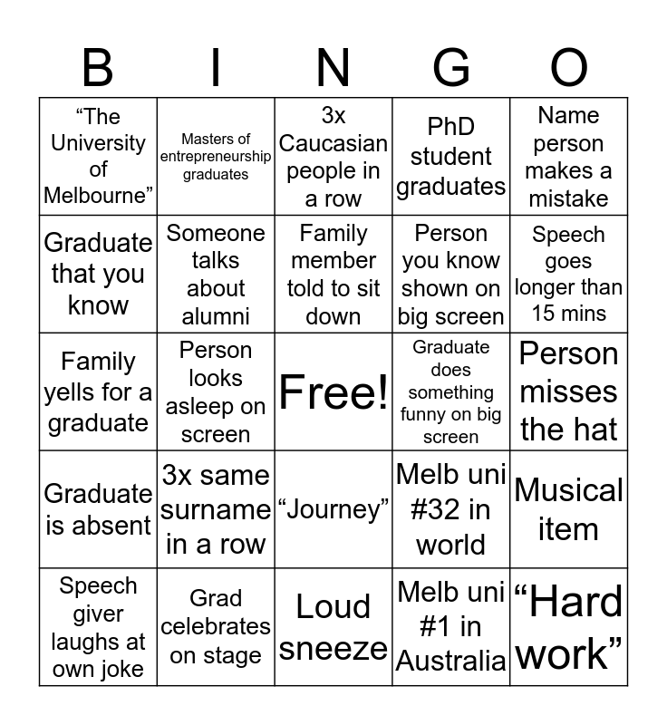 This bingo card has a free space and 24 words: 3x same surname in a row, Grad celebrates on stage, Family member told to sit down, Speech giver laughs at own joke, Name person makes a mistake, “The University of Melbourne”, Graduate that you know, Masters of entrepreneurship graduates, Graduate does something funny on big screen, “Journey”, Person you know shown on big screen, Family yells for a graduate, Melb uni #32 in world, Musical item, Someone talks about alumni, Melb uni #1 in Australia, Person misses the hat, 3x Caucasian people in a row, Speech goes longer than 15 mins, Person looks asleep on screen, “Hard work”, Graduate is absent, PhD student graduates and Loud sneeze.