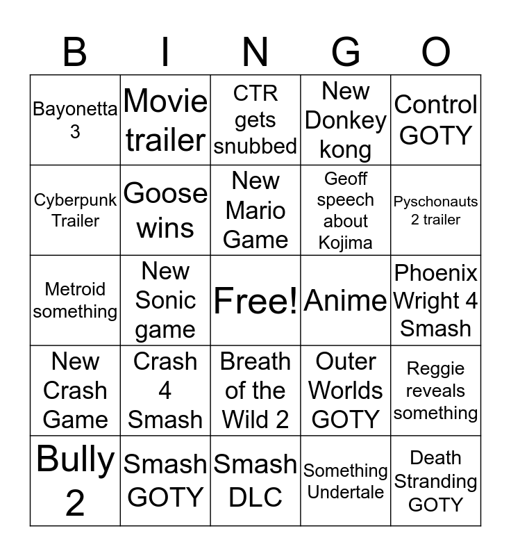 This bingo card has a free space and 24 words: Crash 4 Smash, Smash GOTY, New Mario Game, Bully 2, Control GOTY, Bayonetta 3, Cyberpunk Trailer, Movie trailer, Anime, Breath of the Wild 2, Geoff speech about Kojima, Metroid something, Outer Worlds GOTY, Reggie reveals something, Goose wins, Something Undertale, Phoenix Wright 4 Smash, CTR gets snubbed, Pyschonauts 2 trailer, New Sonic game, Death Stranding GOTY, New Crash Game, New Donkey kong and Smash DLC.