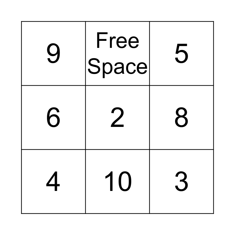 This bingo card has 11 words: 1, 2, 3, 4, Free Space, 5, 6, 7, 8, 9 and 10.