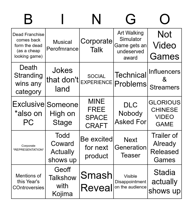 This bingo card has a free space and 24 words: Todd Coward Actually shows up, Geoff Talkshow with Kojima, SOCIAL EXPERIENCE, Mentions of this Year's COntroversies, Not Video Games, Dead Franchise comes back form the dead (as a cheap looking game), Death Stranding wins any category, Musical Perofmrance, DLC Nobody Asked For, Be excited for next product, Technical Problems, Exclusive *also on PC, Next Generation Teaser, Trailer of Already Released Games, Jokes that don't land, Visible Disappointment on the audience, GLORIOUS CHINESE VIDEO GAME, Corporate Talk, Influencers & Streamers, Someone High on Stage, Stadia actually shows up, Corporate *REPRESENTATION*, Art Walking Simulator Game gets an undeserved award and Smash Reveal.