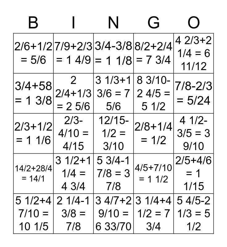 This bingo card has 25 words: 3 1/2+1 1/4 = 4 3/4, 3 4/7+2 9/10 = 6 33/70, 3 1/3+1 3/6 = 7 5/6, 5 1/2+4 7/10 = 10 1/5, 4 2/3+2 1/4 = 6 11/12, 2/6+1/2 = 5/6, 3/4+58 = 1 3/8, 7/9+2/3 = 1 4/9, 2/8+1/4 = 1/2, 5 3/4-1 7/8 = 3 7/8, 8 3/10-2 4/5 = 5 1/2, 2/3+1/2 = 1 1/6, 4/5+7/10 = 1 1/2, 2/5+4/6 = 1 1/15, 2 2/4+1/3 = 2 5/6, 5 4/5-2 1/3 = 5 1/2, 4 1/2-3/5 = 3 9/10, 3/4-3/8 = 1 1/8, 7/8-2/3 = 5/24, 2/3-4/10 = 4/15, 12/15-1/2 = 3/10, 2 1/4-1 3/8 = 7/8, 14/2+28/4 = 14/1, 8/2+2/4 = 7 3/4 and 3 1/4+4 1/2 = 7 3/4.