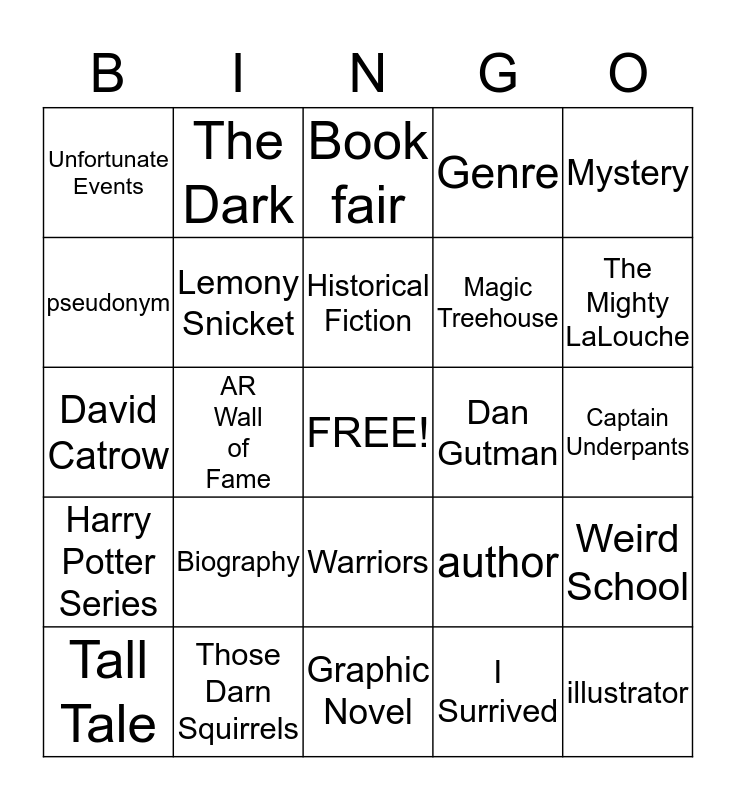 This bingo card has a free space and 24 words: Biography, Those Darn Squirrels, Historical Fiction, Tall Tale, Mystery, Unfortunate Events, pseudonym, The Dark, Dan Gutman, Warriors, Magic Treehouse, David Catrow, author, Weird School, Lemony Snicket, I Surrived, Captain Underpants, Book fair, The Mighty LaLouche, AR Wall of Fame, illustrator, Harry Potter Series, Genre and Graphic Novel.