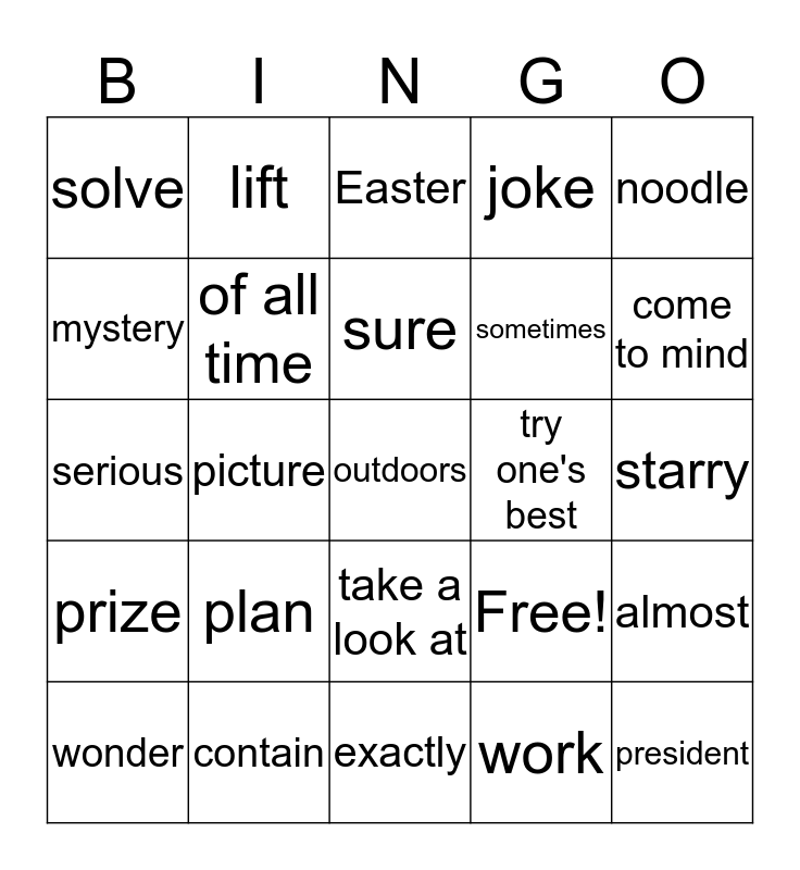 This bingo card has 25 words: plan, exactly, sure, wonder, noodle, solve, mystery, lift, try one's best, take a look at, sometimes, serious, Free!, almost, of all time, president, starry, Easter, come to mind, picture, outdoors, contain, prize, joke and work.