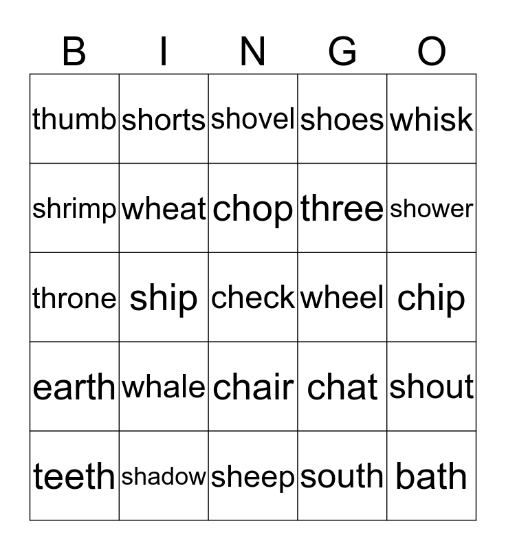 This bingo card has a free space and 24 words: whale, shadow, chop, teeth, whisk, thumb, shrimp, shorts, wheel, chair, three, throne, chat, shout, wheat, south, chip, shovel, shower, ship, bath, earth, shoes and sheep.