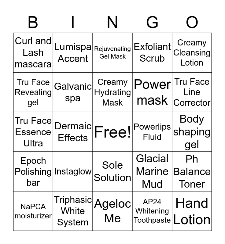 This bingo card has a free space and 44 words: Facial Spa, Hand Lotion, Epoch Baobab Body Butter, NaPCA moisturizer, Lumispa, AP24 Whitening Toothpaste, Rejuvenating Gel Mask, Body Bar, Creamy Cleansing Lotion, Triphasic White System, Exfoliant Scrub, Powerlips Fluid, Sole Solution, Instaglow, Lip Plumbing Balm, Ageloc Me, Tru Face Priming Solution, Tru Face Essence Ultra, Enhancer skin Conditioning Gel, Tru Face Line Corrector, Lumispa Accent, Lumispa Ideal Eyes, Rejuvenating Cream, Curl and Lash mascara, TFEU Uplifting cream, Body shaping gel, Sunright spf 50, Intensive eye Complex, Glacial Marine Mud, Epoch Polishing bar, Body Cleansing Gel, Ph Balance Toner, 180 Wash, Facial Scrub, Dermaic Effects, Restore Intensive moisturizer, Powerlips Polish Duo, Clay Pack, Creamy Hydrating Mask, Tru Face Revealing gel, Power mask, Waterproof makeup remover, Galvanic spa and Sunright Lip balm.