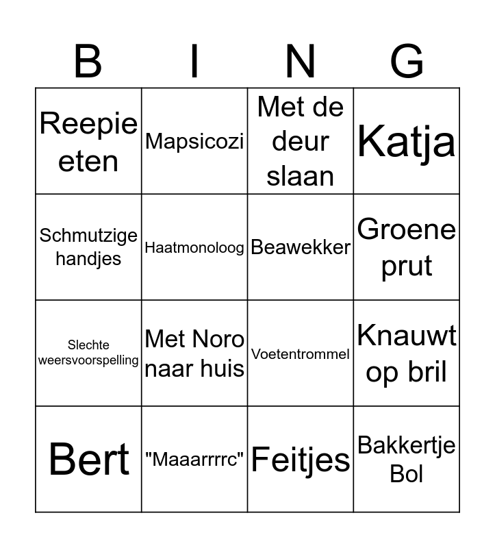 This bingo card has 16 words: "Maaarrrrc", Knauwt op bril, Met de deur slaan, Reepie eten, Slechte weersvoorspelling, Mapsicozi, Voetentrommel, Feitjes, Schmutzige handjes, Haatmonoloog, Bert, Katja, Met Noro naar huis, Groene prut, Beawekker and Bakkertje Bol.