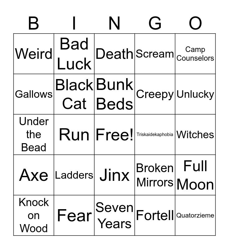 This bingo card has a free space and 36 words: Jason, Summer Camp, Hockey Mask, Black Cat, Broken Mirrors, Axe, Bunk Beds, Lake, Camp Counselors, Hide, Run, Scream, Cry, Triskaidekaphobia, Unlucky, Weird, Superstitious, Ladders, Quatorzieme, Death, Witches, Full Moon, Fear, Knock on Wood, Seven Years, Bad Luck, Under the Bead, Spells, Creepy, Gallows, Scary Movies, Cabin, Fortell, Jinx, Kismet and Unlucky.