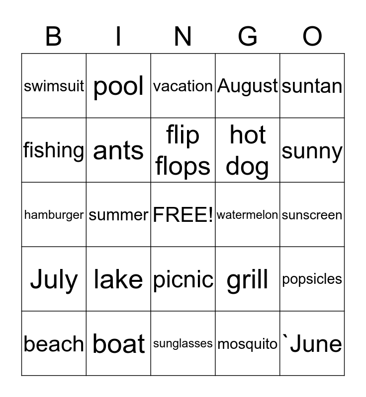 This bingo card has a free space and 24 words: lake, boat, flip flops, beach, suntan, swimsuit, fishing, pool, watermelon, picnic, hot dog, hamburger, grill, popsicles, ants, mosquito, sunscreen, vacation, sunny, summer, `June, July, August and sunglasses.
