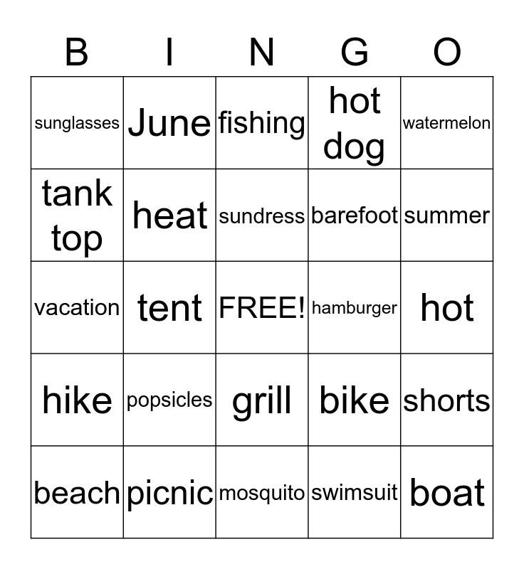 This bingo card has a free space and 44 words: lake, boat, flip flops, beach, suntan, swimsuit, fishing, pool, watermelon, picnic, hot dog, hamburger, grill, popsicles, ants, mosquito, sunscreen, vacation, sunny, summer, June, July, August, sunglasses, sunburn, hot, play, outside, bike, hike, cookout, shorts, mow, camping, tent, campfire, sunglasses, bugs, sundress, tank top, barefoot, ice cream, heat and swimming.