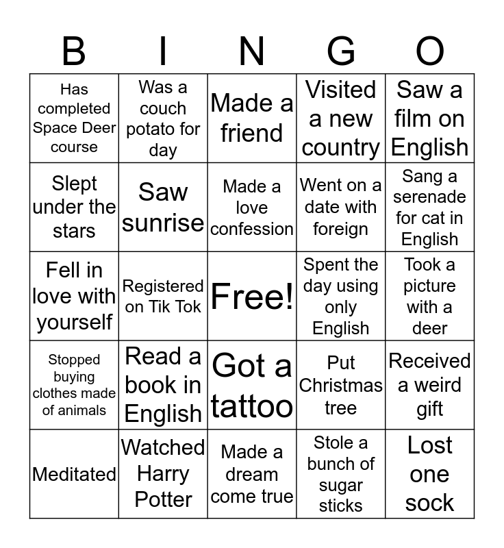 This bingo card has a free space and 24 words: Read a book in English, Watched Harry Potter, Made a love confession, Meditated, Saw a film on English, Has completed Space Deer course, Slept under the stars, Was a couch potato for day, Spent the day using only English, Got a tattoo, Went on a date with foreign, Fell in love with yourself, Put Christmas tree, Received a weird gift, Saw sunrise, Stole a bunch of sugar sticks, Took a picture with a deer, Made a friend, Sang a serenade for cat in English, Registered on Tik Tok, Lost one sock, Stopped buying clothes made of animals, Visited a new country and Made a dream come true.